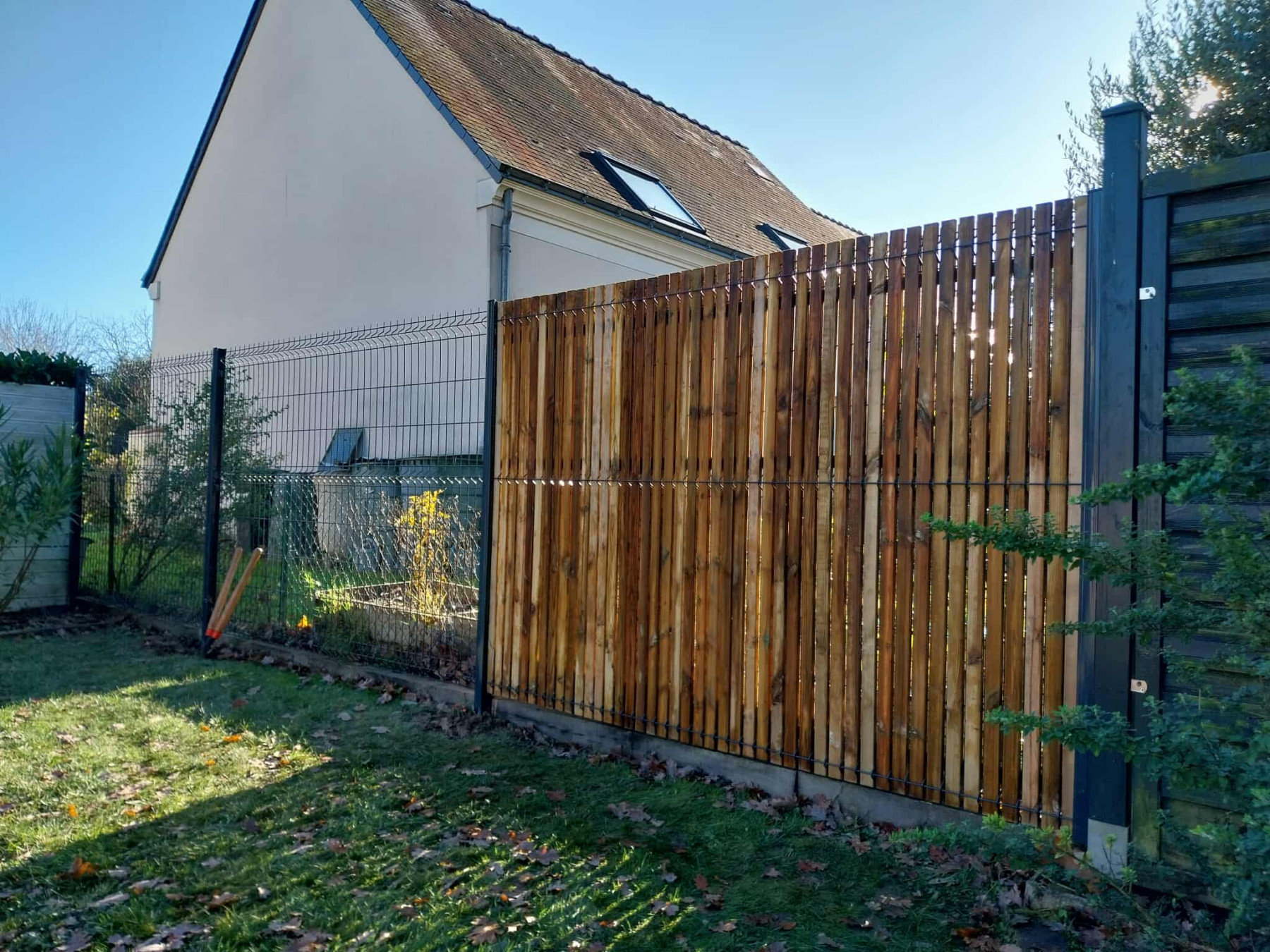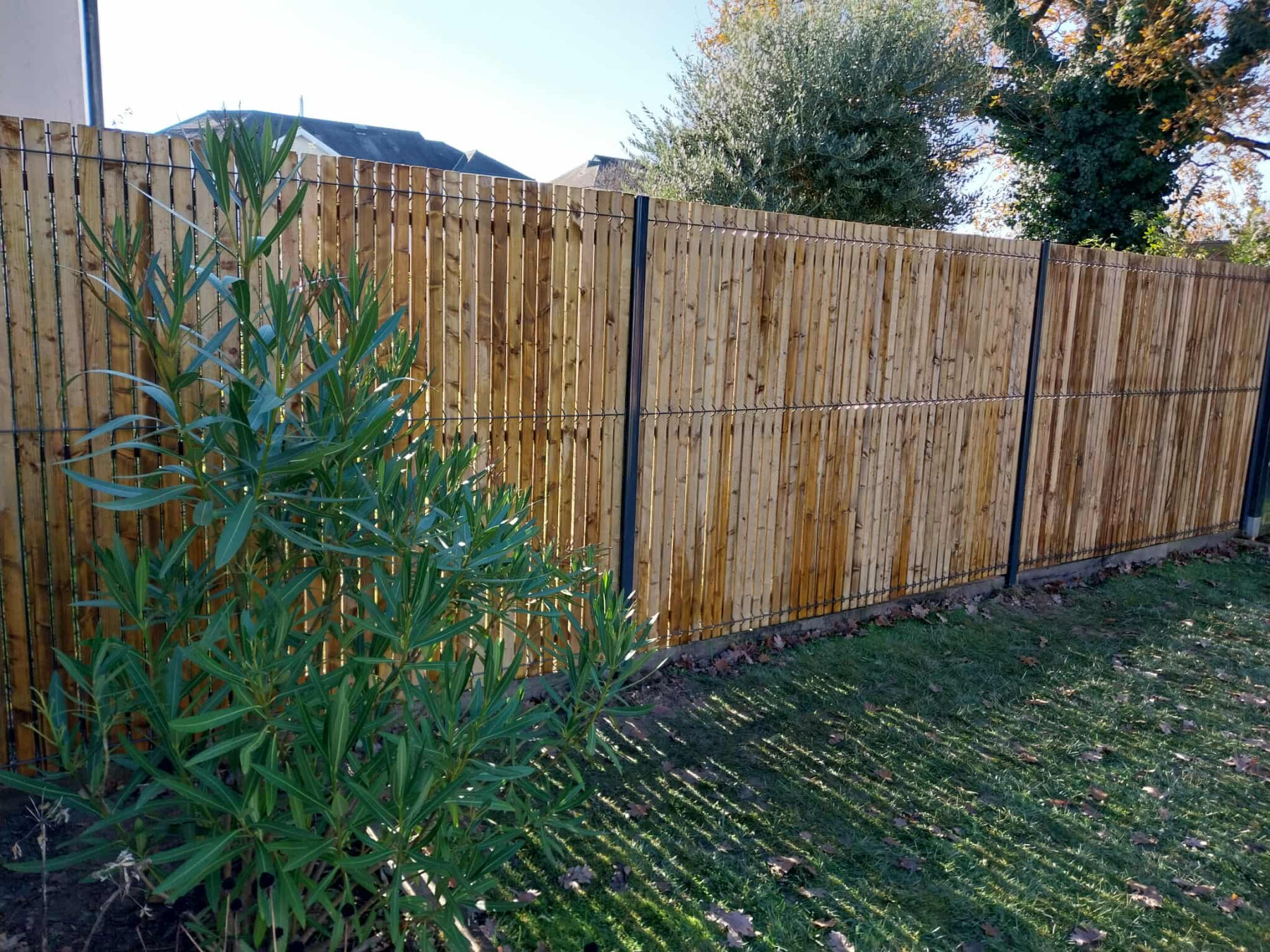Grilles rigide 172 cm avec soubassement chêne, poteaux acier scellé dans le béton.